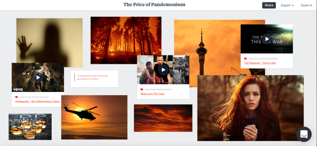 I put together a board for the book I’m currently editing, The Price of Pandemonium. I began by searching for images that to me held significance, it could have been a character, a plot event, or even the mental state of a character (represented by a shadowy figure). There were some that I initially included (I was going to include more characters) but I soon realised that, although character is important, it wasn’t necessary to clog up the board space with every character and detracted from the ‘mood’ I was trying to convey. For me, orange has always been the colour I’ve been attracted to for this book so I knew from the start I was searching for images of this colour. The quote I chose I wanted to represent the whole book. There is a lot of destruction in this book, of both physical and emotional nature, so it reads: “a rising black cloud consumed everything in its path.” As for songs, I listened to several before deciding on three which to me represented the book more as a whole. In particular, ‘Run’ by One Republic surprised me because of its more upbeat tone, but I reflected there are some pretty fun elements in the book! Finally, an interesting tip from the creators of milanote was to resize images to be representative of their importance, and I feel this really helped me understand which elements of the plot I viewed as most significant to the overall storyline.